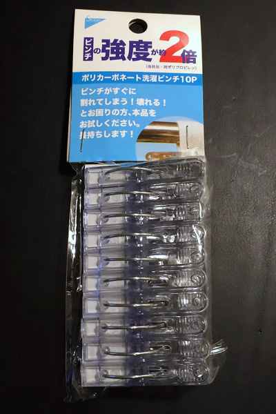 My plastic clothespins kept snapping, so I tried 100-yen polycarbonate ones—nine years later they’re still fine