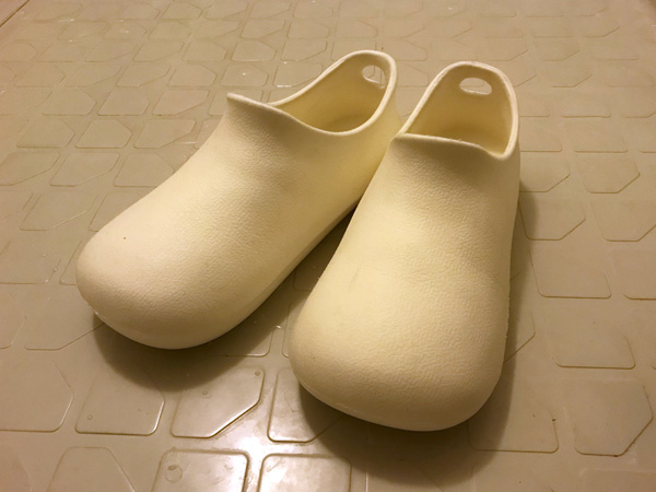Plastic bath slippers were icy on bare feet. EVA slippers (Crocs-like) stayed warm, fit well, and have not molded after a year--worth the ~1,000 yen.